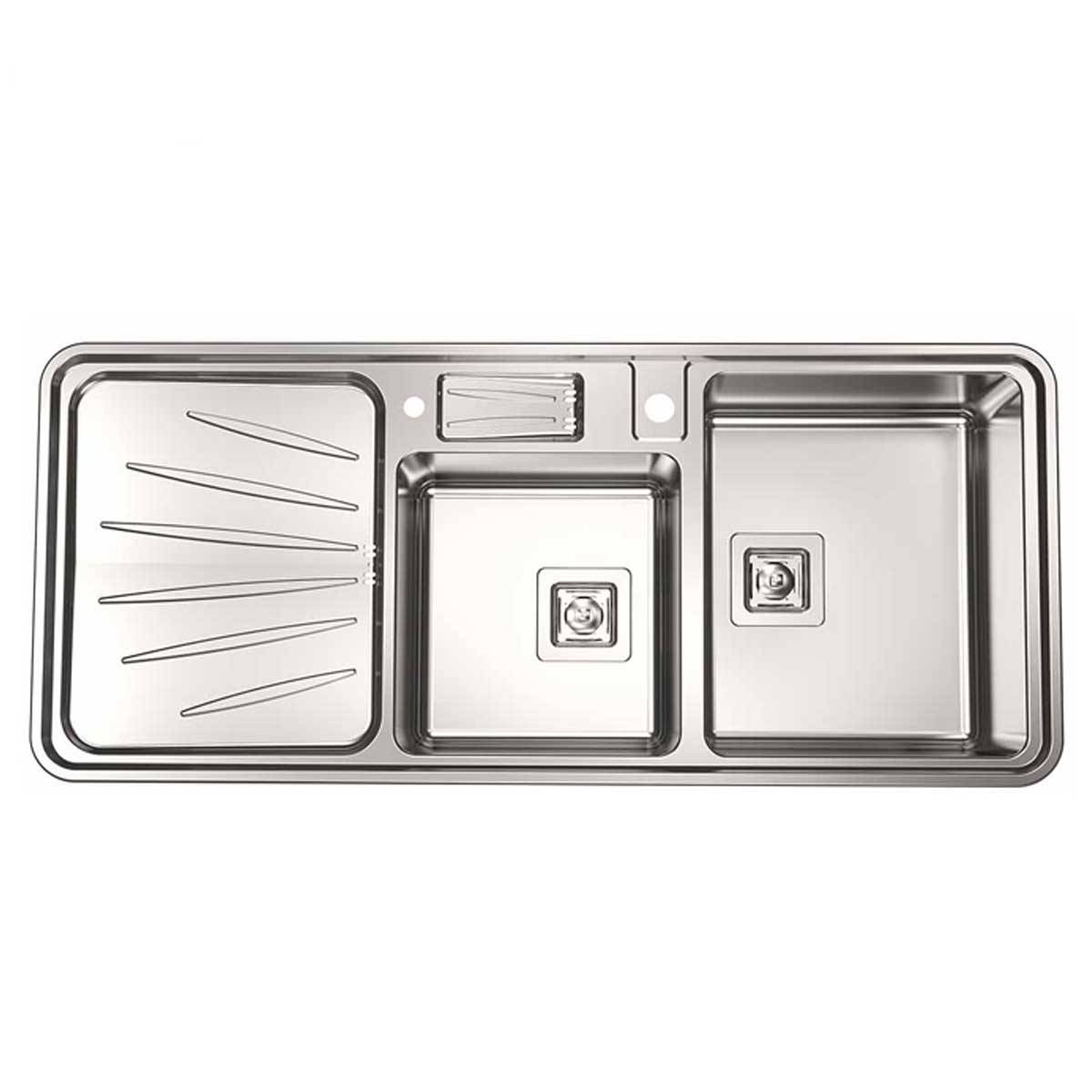 سینک توکار مدل ۸۵۴ استیل البرز ترکیبی از طراحی مدرن، کیفیت ساخت بالا و امکانات کاربردی است که برای آشپزخانه‌ای زیبا و کارآمد گزینه‌ای ایده‌آل محسوب می‌شود.• لگن‌های عمیق امکان شست‌وشوی آسان ظروف بزرگ را فراهم می‌کنند.سینک 854 استیل البرز دارای دو لگن عمیق به عمق 18 سانتیمتر و ضخامت 0/8 میلیمتر و باکسی می باشد.ظرفیت لگن این سینک 47.5 لیتر می باشد و همچنین دارای جااسکاجی، جامایع، سبد میوه شور و تخت کار می باشد.سینک آشپزخانه استیل البرز دارای زیرآب های مربع و جدید می باشد.محل قرار گیری شیرآب در سینک استیل البرز نیز بر روی سینک تعبیه شده است.